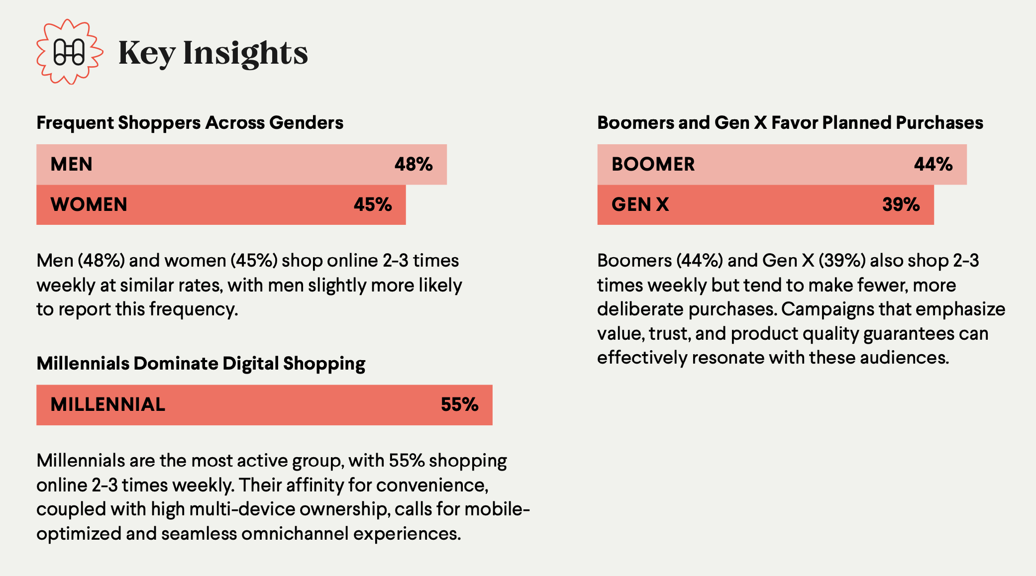 - 44% of Boomers shop online multiple times a week, while 39% of Gen X do so. These cohorts tend of shop more purposefully and prioritize planned and value-oriented purchases.