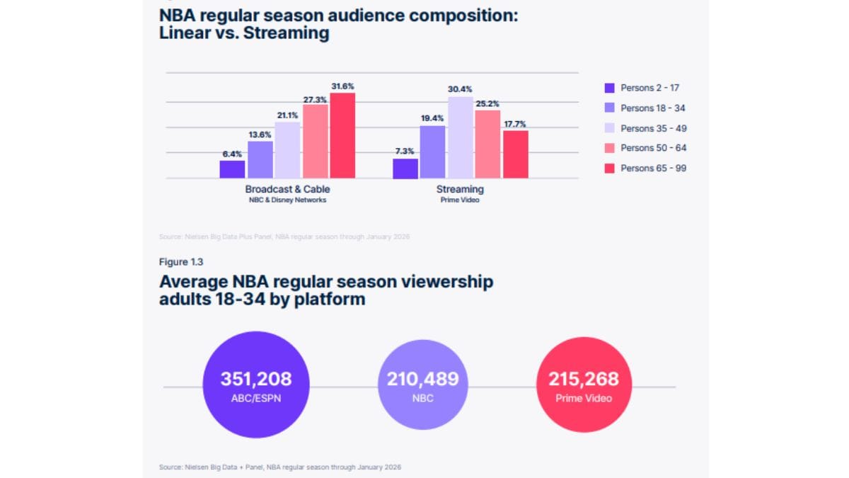 Looking at the NBA, which this season got a boost by moving a number of games to NBC, Nielsen found that the concentration of viewers in the 18-49 and 35-49 age brackets was higher on Prime Video than on the NBCU and Disney networks.