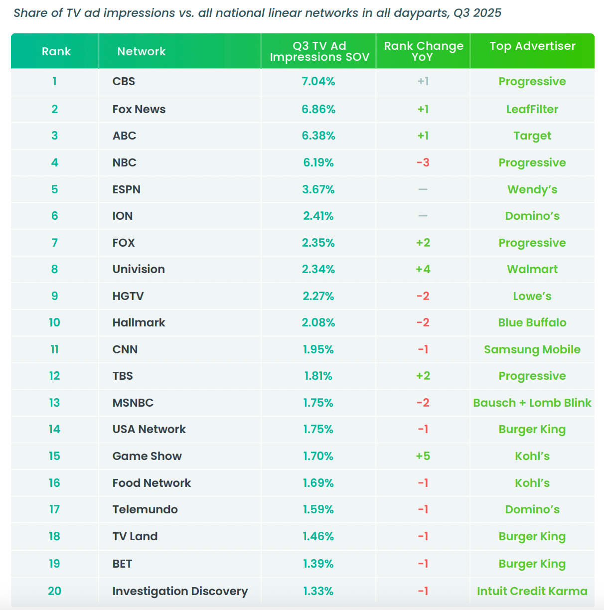 The TV networks generating the biggest share of household TV ad impressions are CBS (7.04%) and Fox News Channel (6.86%). ABC (6.38% of impressions), NBC (6.19%) and ESPN (3.67%) rounded out the top five.