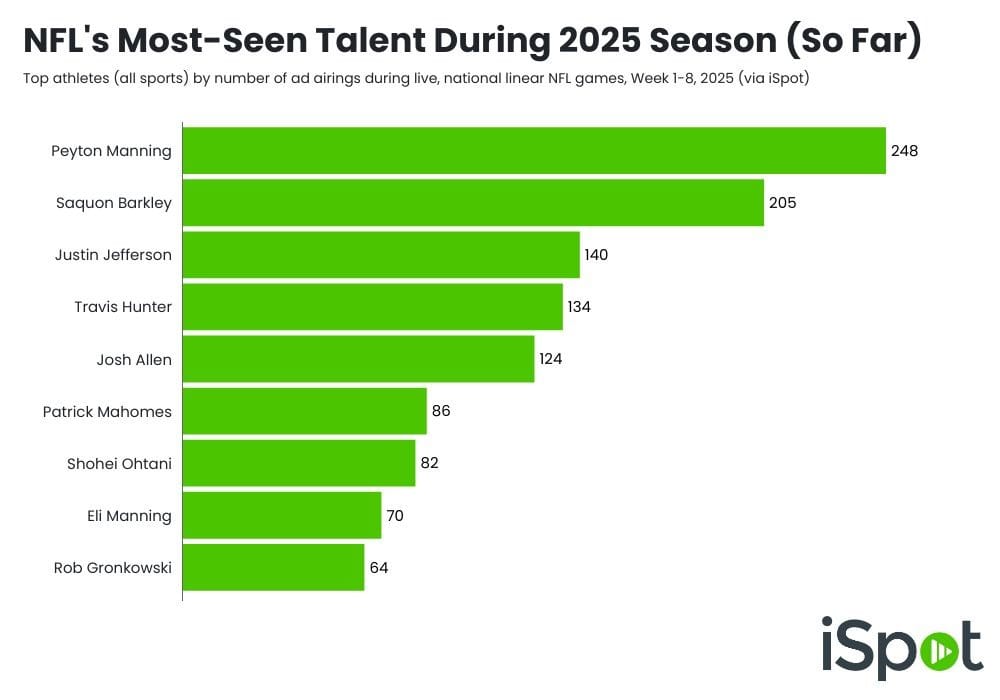 - Peyton Manning, Saquon Barkley, Justin Jefferson, Travis Hunter and Josh Allen complete the top 5 by national TV ad airings during NFL games.