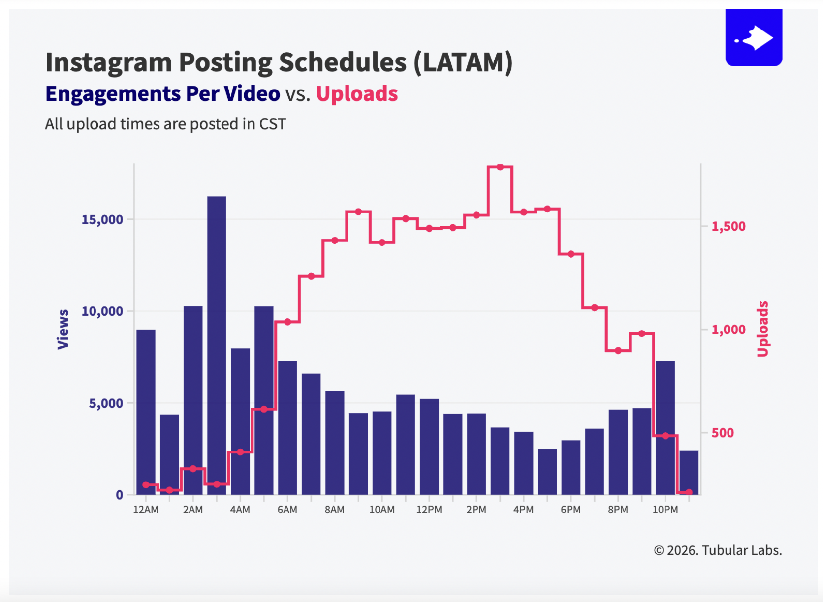 Latin American news publishers tend to post on Instagram in the afternoon — but their audiences are actually early birds. Tubular Labs data highlights how the most views per video are concentrated in early morning, despite low upload volume. [READ MORE]