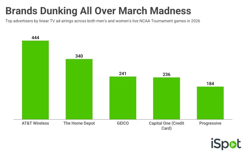 Not only did AT&T aired the most ads through the Elite 8 of the NCAA Men's Basketball Tournament, but they've done so during the women's event as well. iSpot data shows the wireless carrier outpaced other cross-tourney advertisers by over 100 airings. [READ MORE]