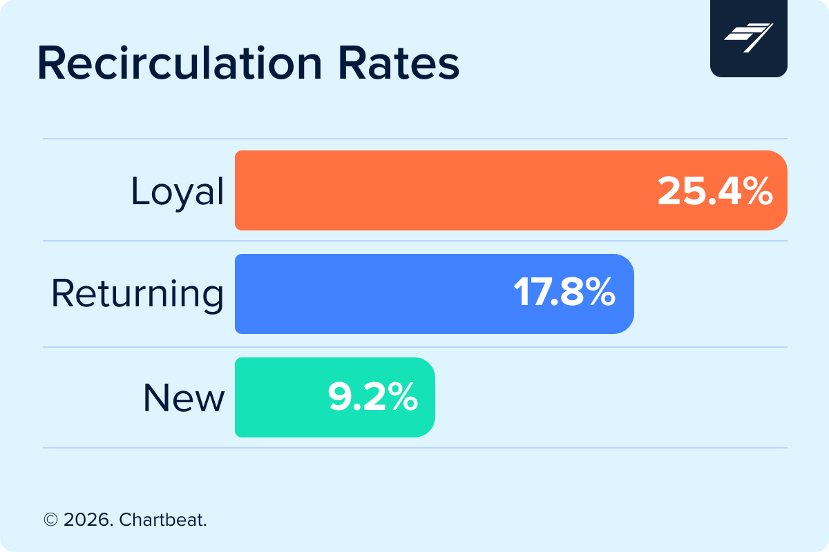 With as much as 40% of pageviews driven by internal traffic, recirculation links – links driving readers to other content on the site – are essential. Chartbeat research showcases how recirculation works even better with loyal readers [READ MORE]