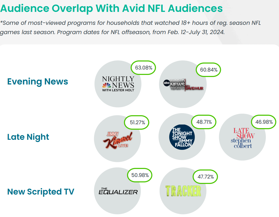 - Late-night, in particular, saw multiple shows hit more than 60% of that avid NFL audience; and while those programs are still premium placements, prices still avoid the highs of the NFL.