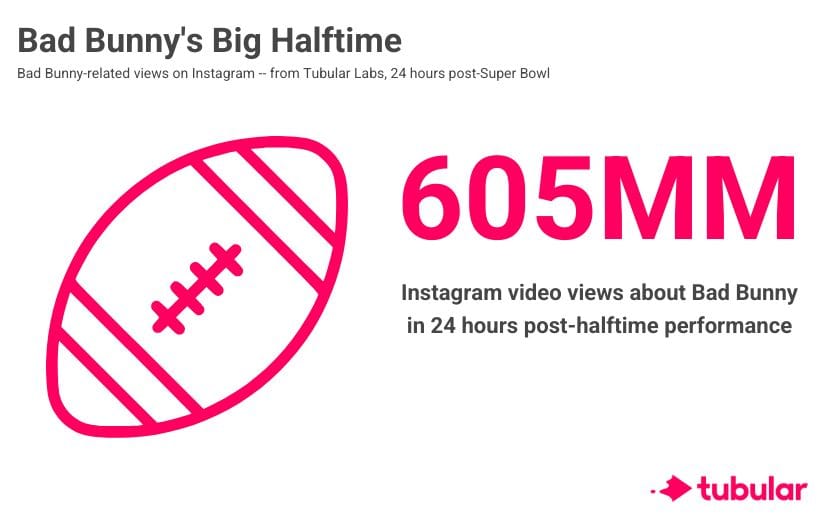 - Tubular data showed that on Instagram alone, videos about Bad Bunny generated over 605 million views.