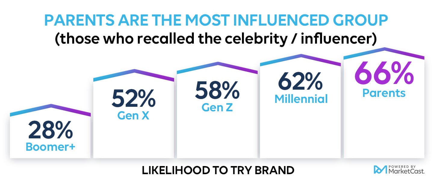 - Gen X and Boomers were less influenced — unless they had kids under 18: 40% of those parents recalled the celebrity/influencer, and a notable 66% were influenced to try the brand.