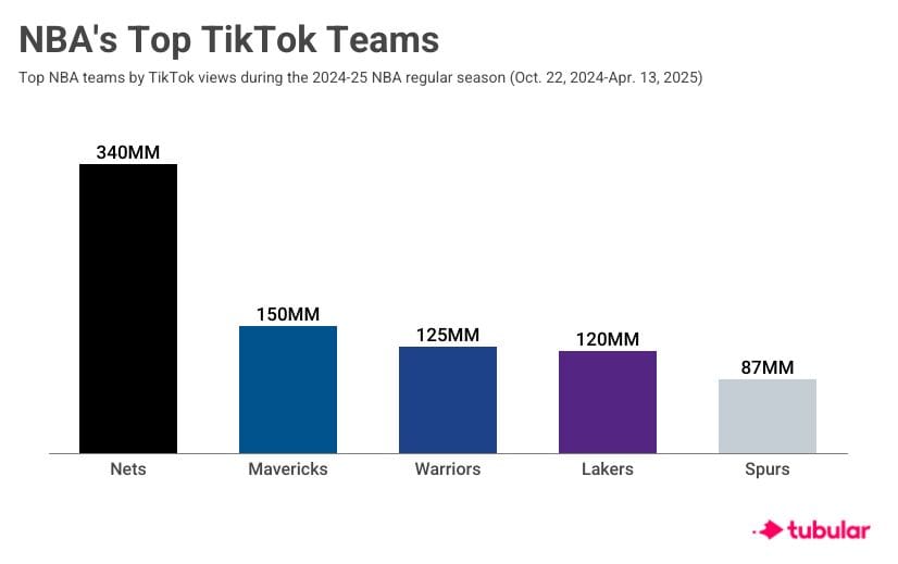 - The Nets led the league by far on TikTok, with 340 views over the course of the 2024-25 season; 190 more than the closest team (the Dallas Mavericks, at 150 million).