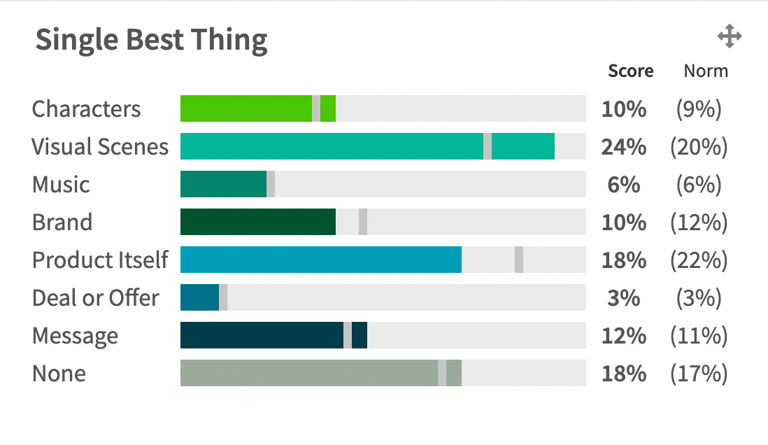 - 10% of consumers surveyed saw the characters (primarily Hunter) as the single best thing about the ad, which was just above the industry norm of 9% – however, 24% found the visual scenes to the ad's best aspect, 18% highlighted the product itself and another 12% felt it was the message.