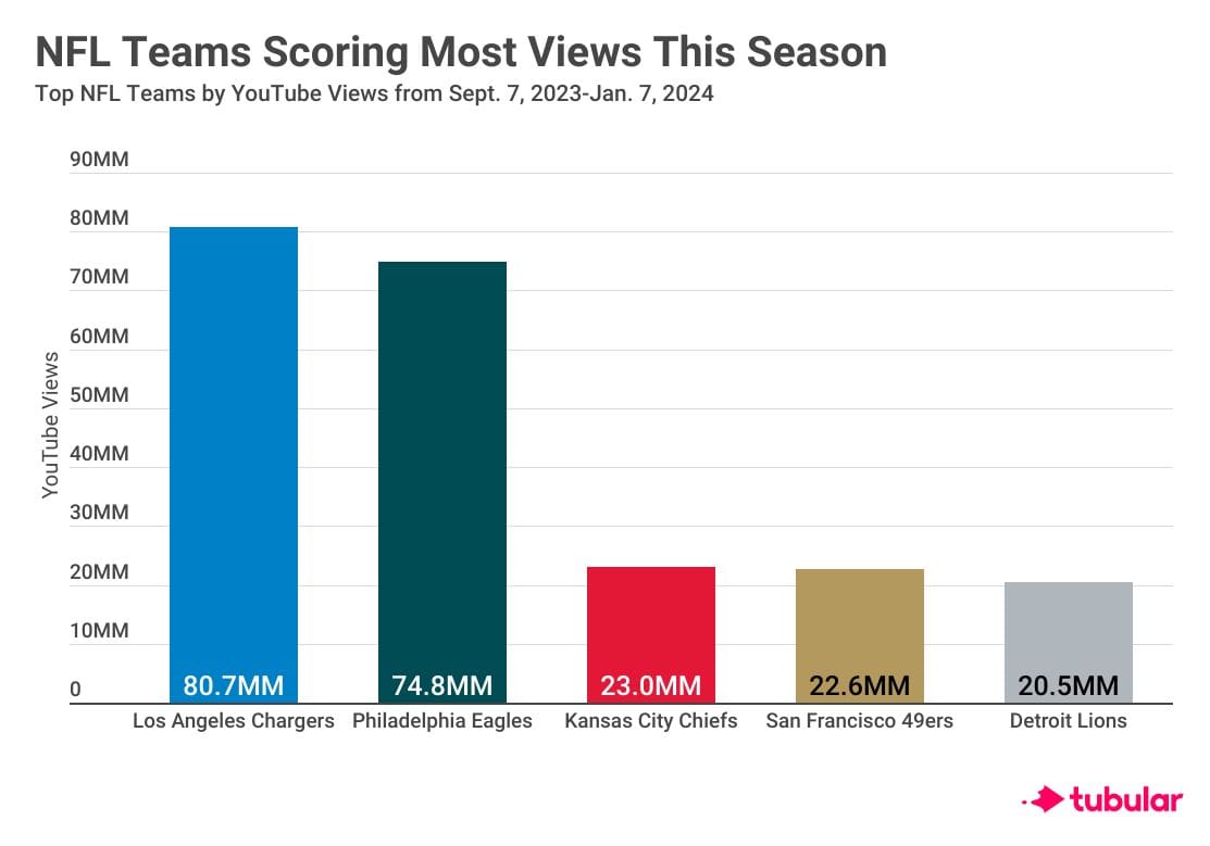 While the Los Angeles Chargers had a rough season on the field, those struggles did not extend to social video. New data from Tubular Labs shows that the Chargers earned more YouTube views than any other team during the NFL's regular season, from Sept. 7, 2023-Jan. 7, 2024, with 80.7 million.