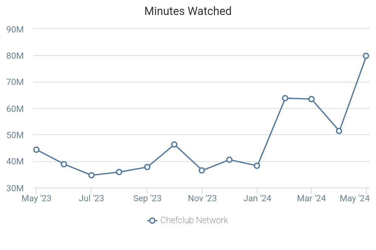 - Watch-time was also up significantly for U.S. viewers, a 55% month-over-month jump to 79.8 million minutes in May 2024. That’s also nearly double Chefclub Network’s watch-time last May, at 44.3 million minutes.