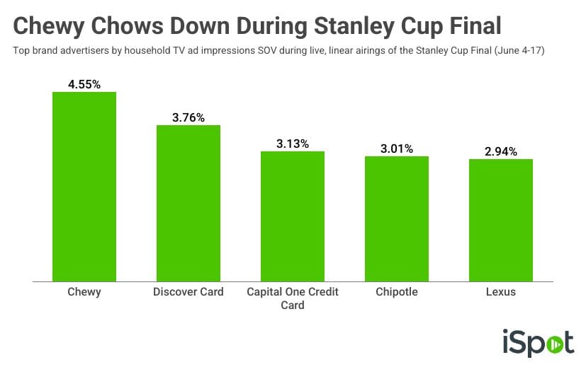 The Stanley Cup Final ended with the Florida Panthers claiming the championship for the second straight year – on the ice. But off the ice, it was pet food brand Chewy collecting a victory in terms of TV ad reach, according to data from iSpot.