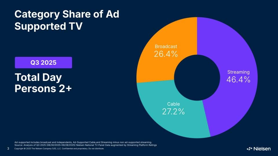 Streaming captured 46.4% of ad-supported viewing, with cable getting 27.2% and broadcast grabbing 26.4%.