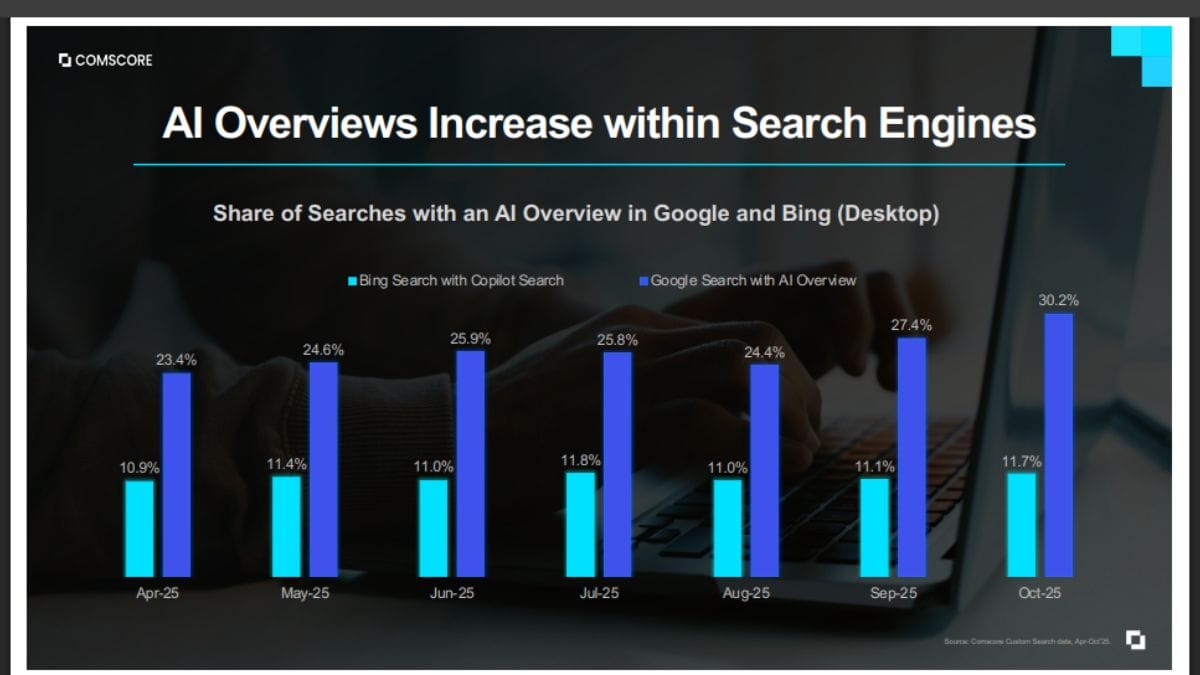 Comscore found that search volume remains strong, up 6% in 3Q year-over-year, but on Google, an AI overview shows up in nearly one of three searches. Those AI overviews appear most frequently across categories including entertainment and sports.
