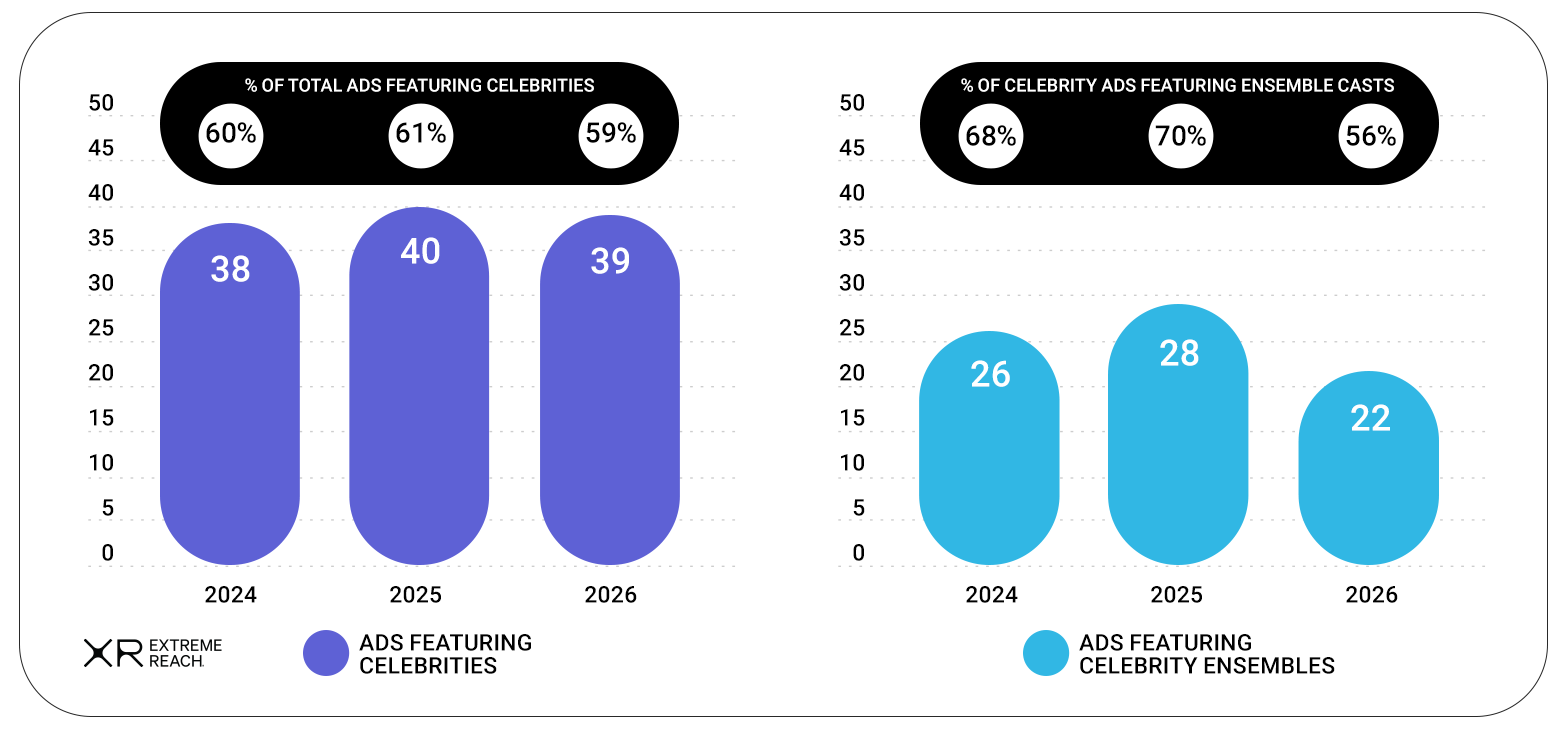 Super Bowl LX's advertising landscape was defined by an unprecedented concentration of celebrity star power, with brands opting for large ensemble casts and cameo-heavy creative to capture instant audience attention according to XR Extreme Reach.