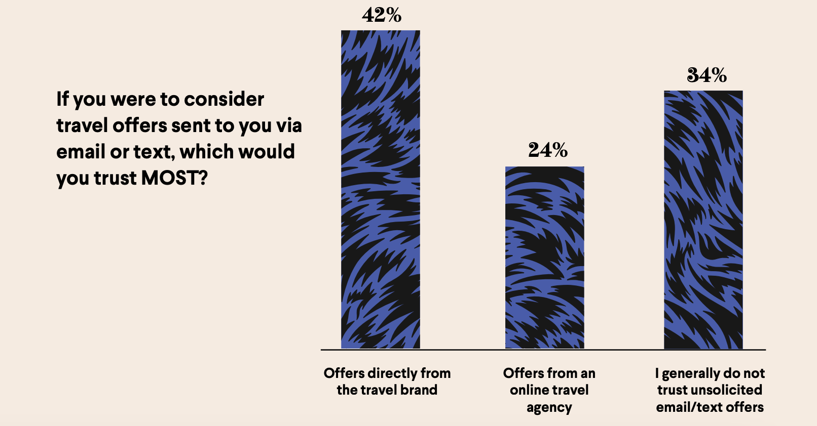 - Although 42% of consumers trust travel brand offers over agencies (24%), most still book through agencies, presenting an opportunity for brands to boost direct bookings and avoid agency fees.