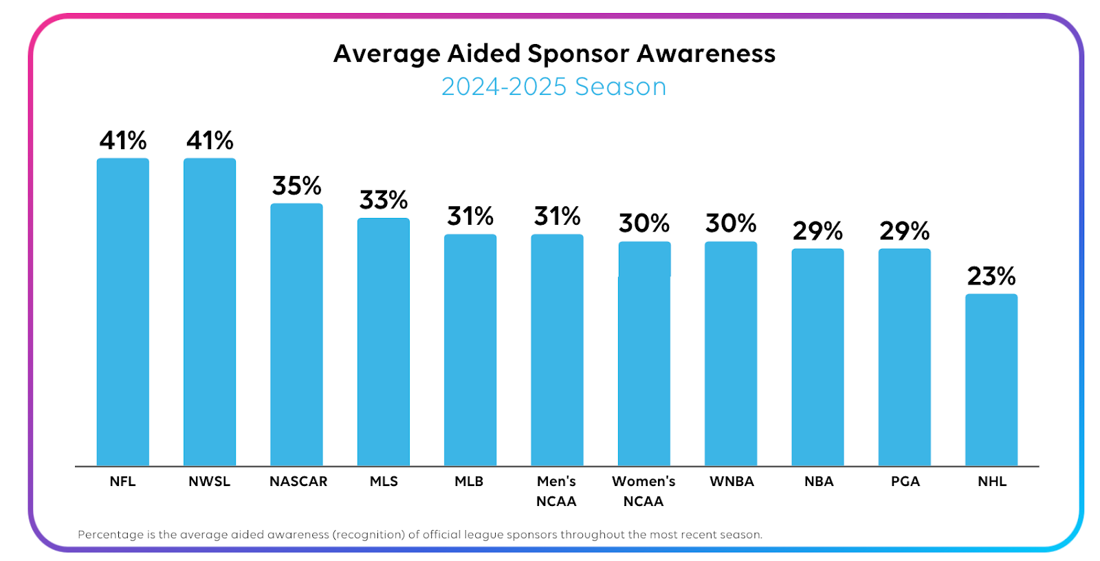 - The National Women’s Soccer League (NWSL) now averages 41% aided sponsor awareness, matching the NFL. This surge underscores both growing fan engagement and the league’s successful partnerships with major sponsors.