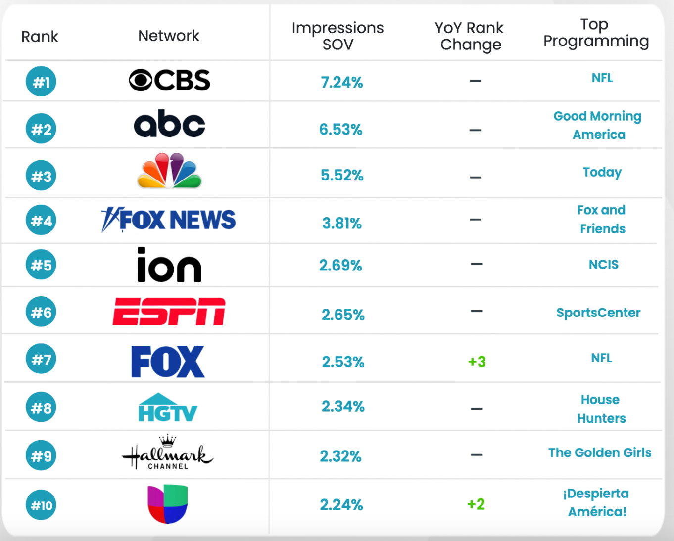 - Univision squeaked into the ranking, helped by a 21% year-over-year increase in TV ad impressions, fueled in part by success with daytime programming.