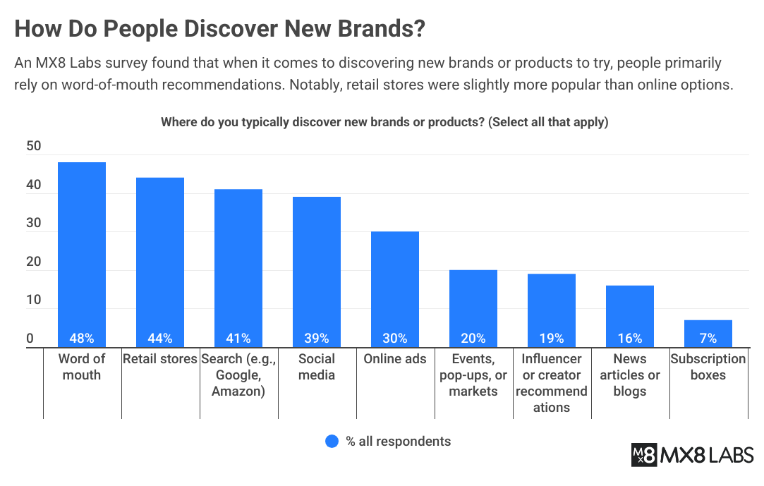 48% of consumers said they discover new brands via word of mouth recommendations, per an MX8 Labs study.