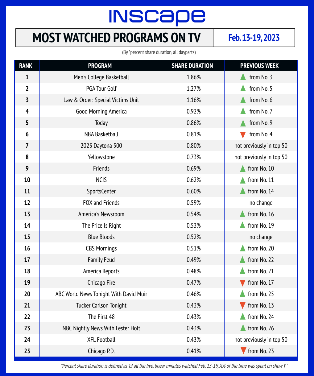 Each week, Inscape's TV By the Numbers rankings reveal the most-watched shows and networks based on live, linear minutes watched. For Feb. 13-19, men's college basketball led with 1.86% of watch-time, followed by PGA Tour Golf (1.27%).