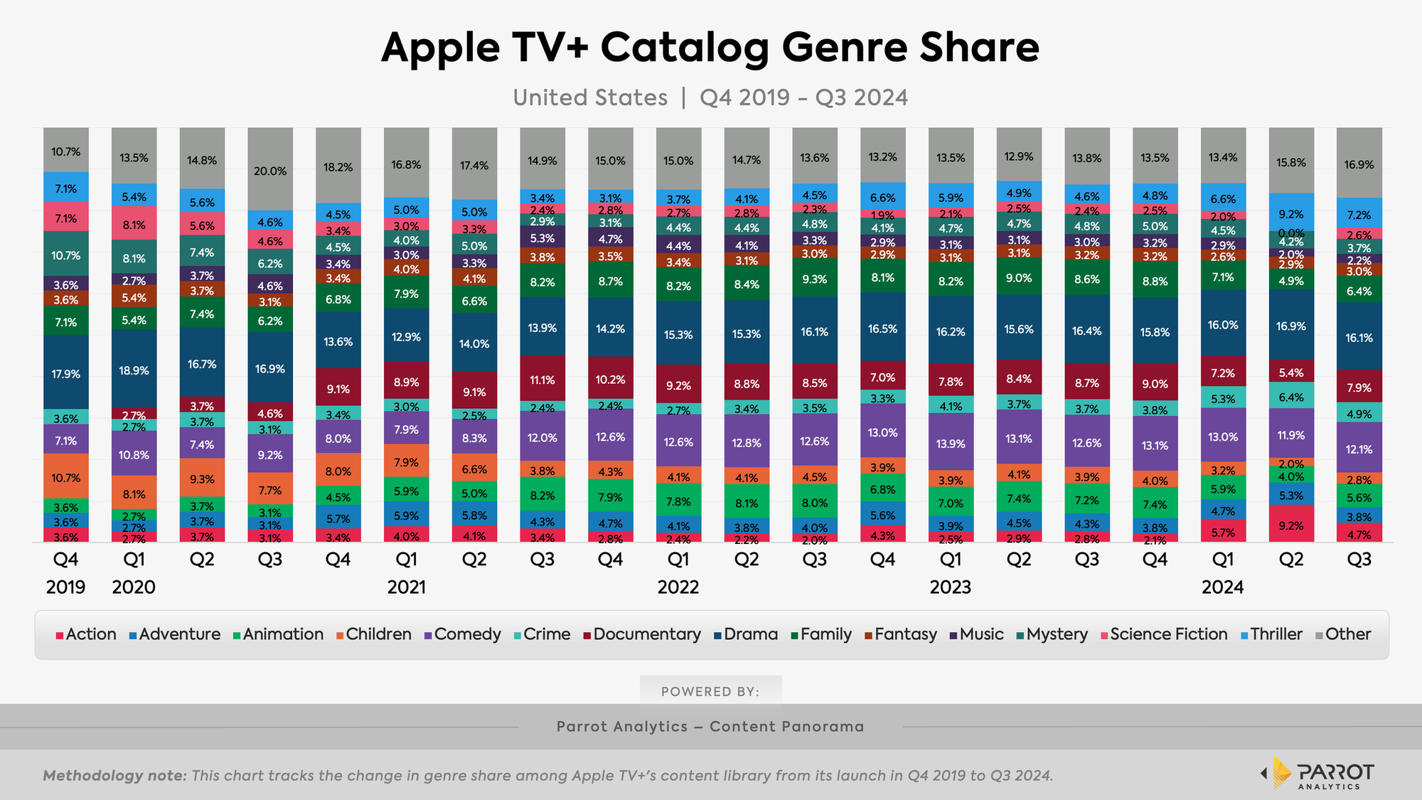- Parrot data found that in Q3 2024, 16.1% of Apple TV+'s U.S. catalog was drama, while 12.1% comedy and 7.9% was fantasy – so over a third baked into three genres.