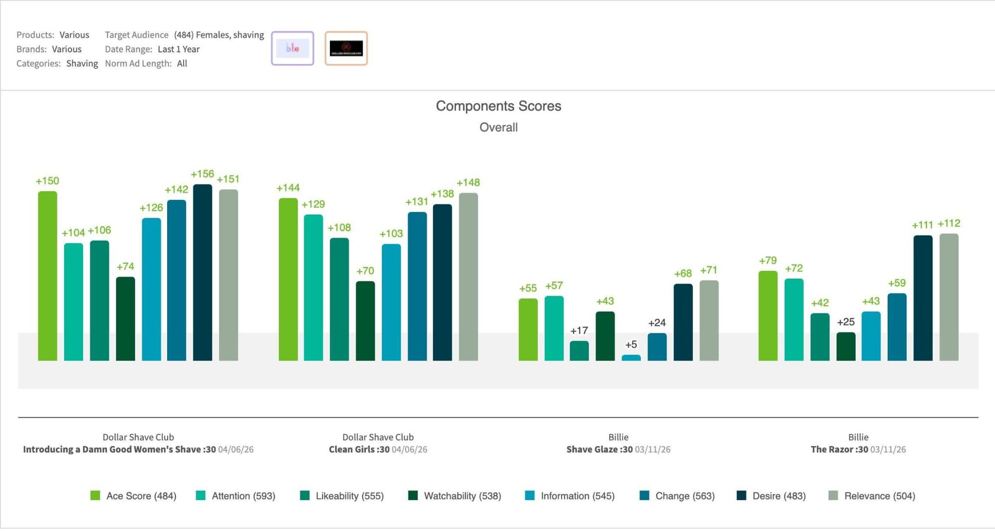 - Superior Competitive Positioning: When compared to recent campaigns from category rivals like Billie, Dollar Shave Club’s creative generated 2–3x the norm lift in overall response among American women.