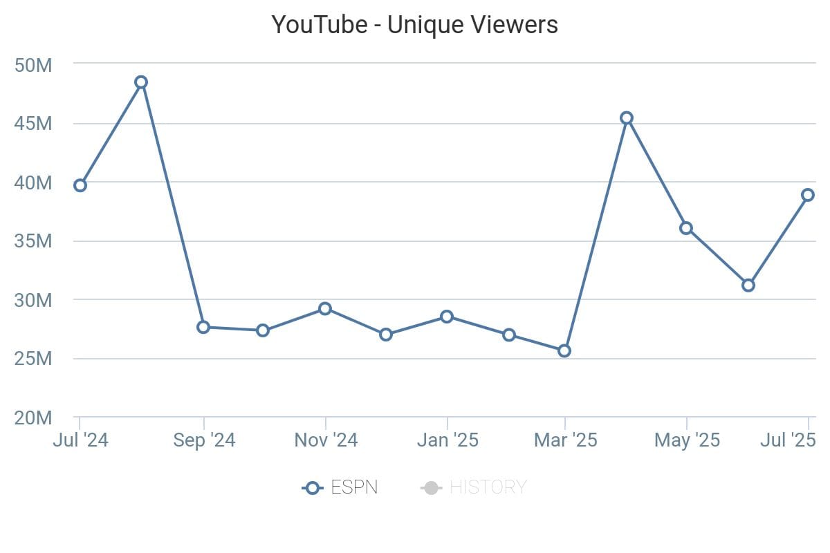 ESPN was able to grow its unique U.S. YouTube viewers by 25% month-over-month in July, to 38.8 million – according to data from Tubular Labs. However, the sports giant is not growing audience on the back of longer-form videos. It’s primarily on Shorts.