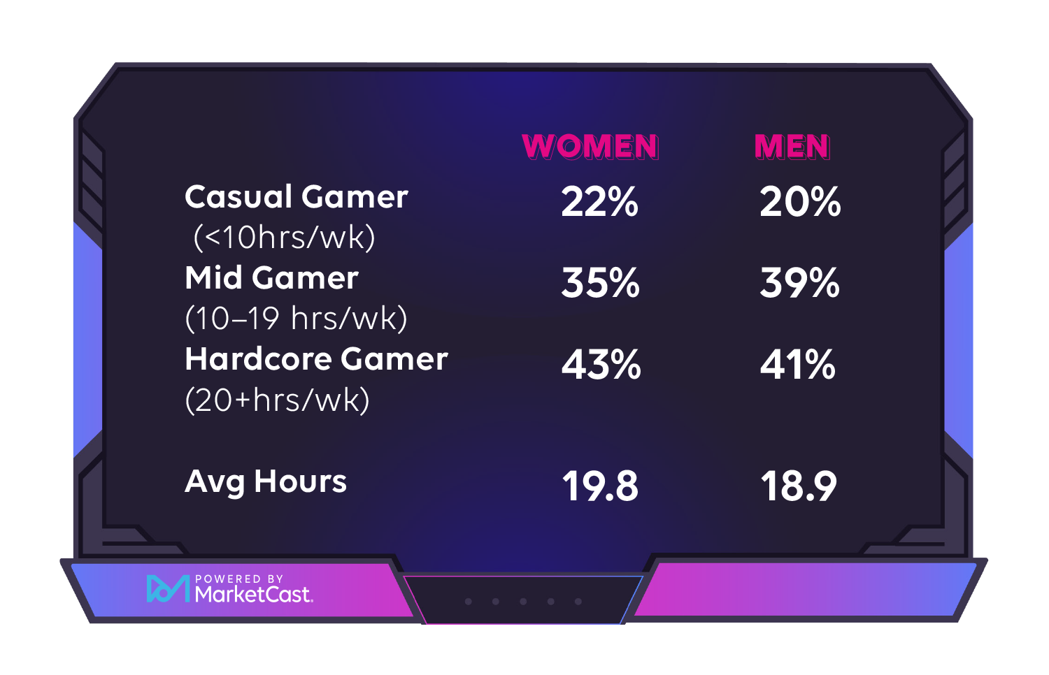43% of women identified as “hardcore gamers,” logging 20 or more hours per week — surpassing the 41% of men who do the same, per MarketCast.