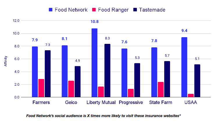- Liberty Mutual and AllState see the highest amount of web traffic from Food Network’s audience, at 10.8x and 10.2x respectively