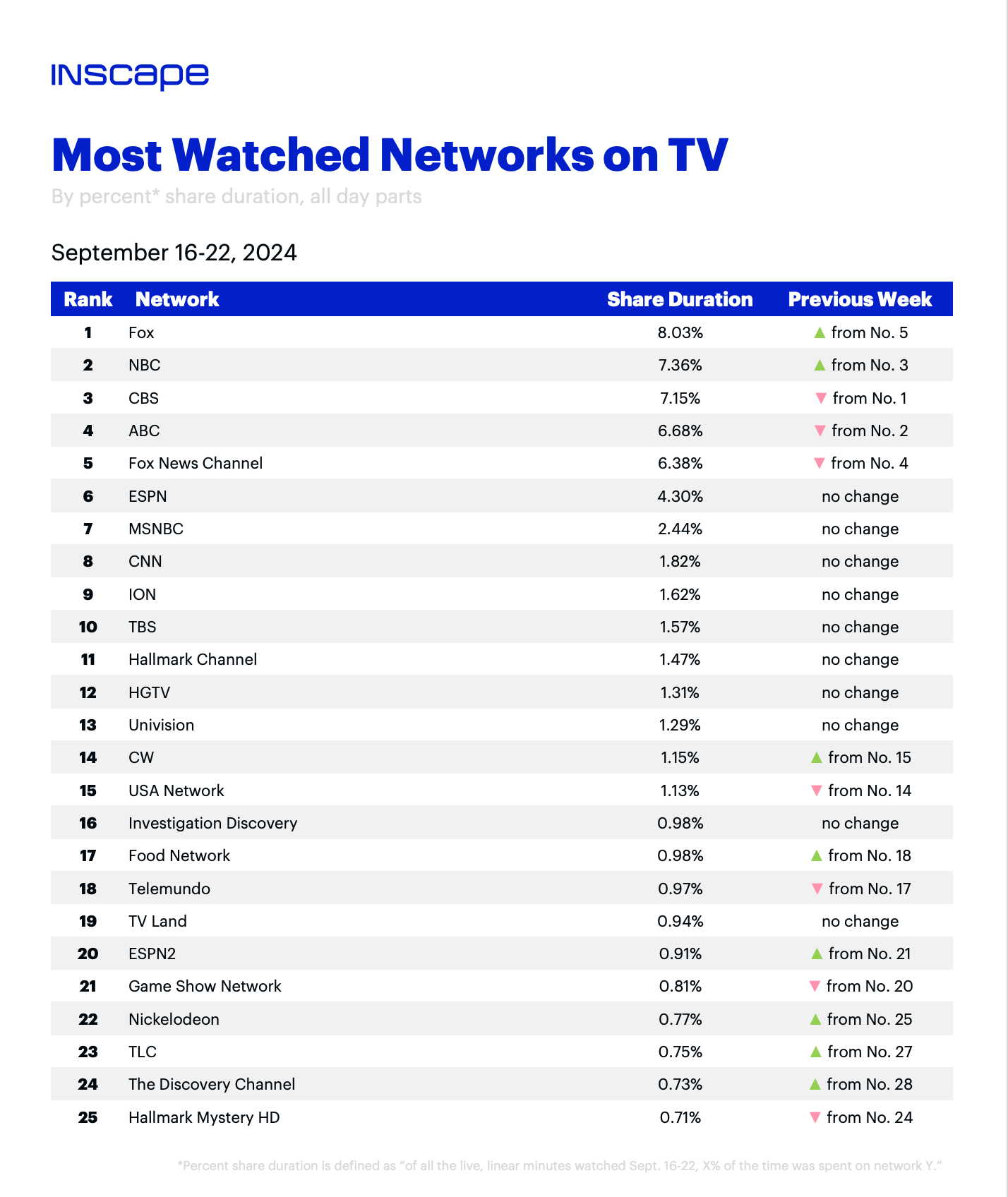 Each week, we highlight the most-watched shows and networks using insights from Inscape, the currency-grade smart TV ACR data provider and data technology division of Vizio. Data is linear, live TV only and includes all episode types (new and reruns). Rankings are by percent share duration (i.e., time spent watching). Here's a look at the top 25 networks by viewership share for September 16-22 — head over to TVREV to see the program ranking and get insights about the top shows by watch-time.