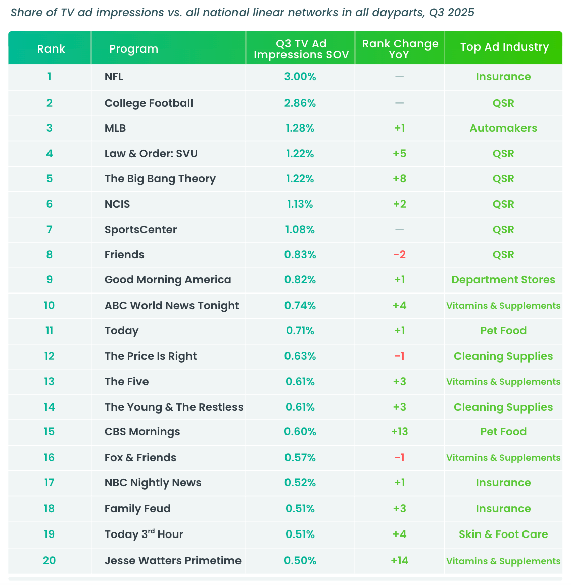 Football, Syndicated Shows Grow TV Ad Reach In Q3 2025
