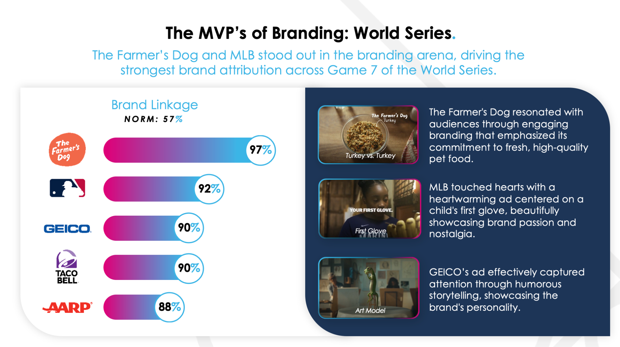 - The strongest brand linkage (how well audiences who remembered the ad also attributed it to the correct brand) was delivered by The Farmer’s Dog (97%) and the MLB itself (92%), topping MarketCast’s “MVPs of Branding” list by ensuring audiences not only remembered their ads but correctly linked them to the brand.
