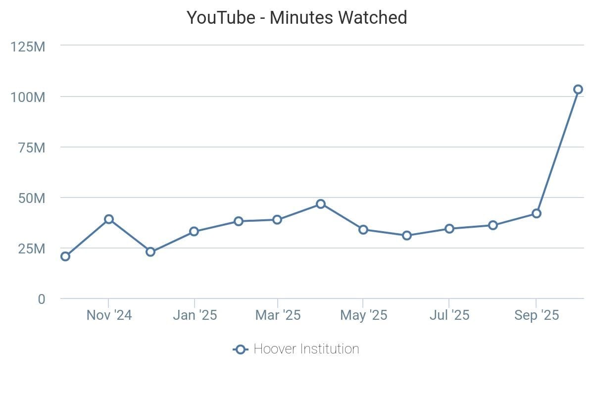 The Hoover Institution (located on Stanford’s campus) has found significant YouTube success lately, not by embracing Shorts or some viral trend outside of its subject area – but instead leaning into deep policy discussions that are defining our time, while getting viewers to tune in for extended periods.