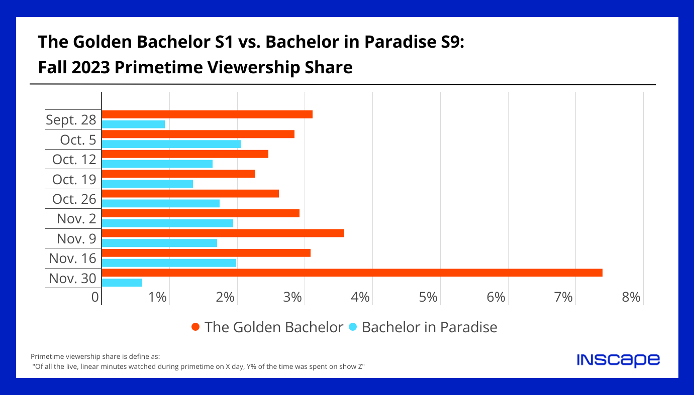 On Nov. 30, the inaugural season wrapped up with 72-year-old bachelor Gerry Turner proposing to Theresa Nist (70 years old) who, of course, said yes. The couple will be wed during a live ABC special on Jan. 4, 2024. Inscape shared a few insights around viewership for the season.