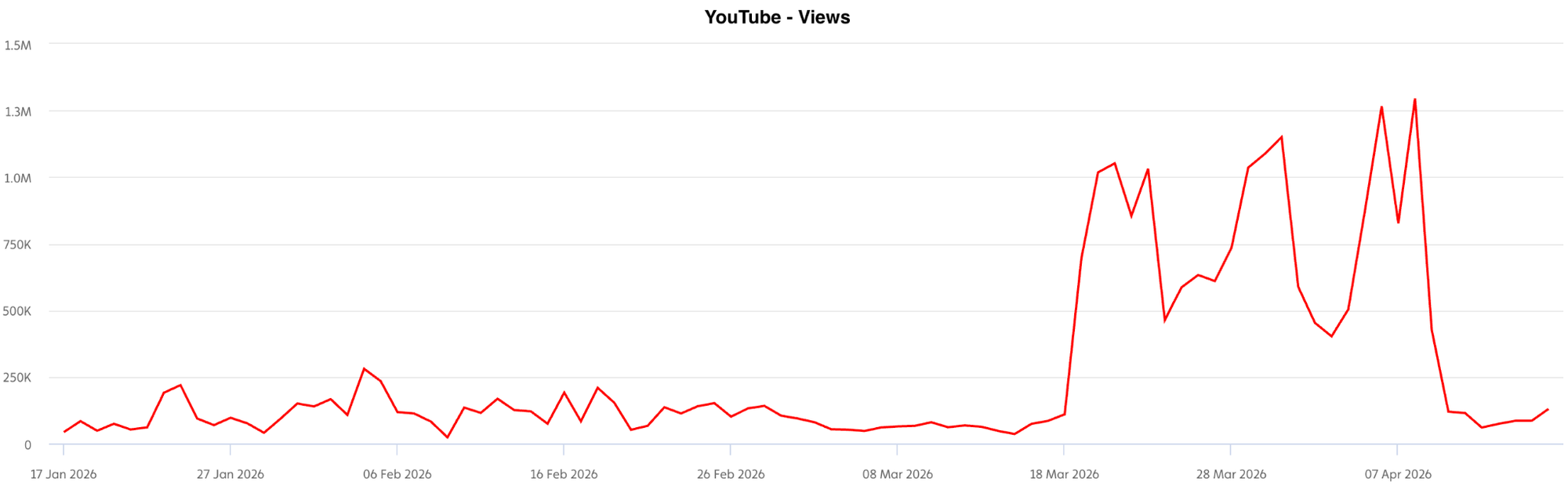 According to data from Tubular Labs, the account saw a 216% increase in unique viewers and a 162% increase in minutes watched on YouTube in March alone. The jump in viewership and engagement is largely attributed to their new advertisement, Savings Wrangler Elevator 15 59, a unique, off-beat spot uploaded to YouTube on March 6, 2026. Since its release, the advertisement has generated 16.2M views to date but with only 37 engagements total.
