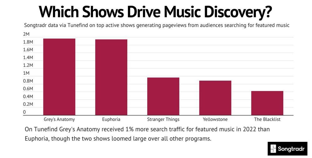 Say what you will about Grey’s Anatomy, but the show has its fans – and music searchers, as end-of-year data from Tunefind (a Songtradr company) recently revealed. Grey’s Anatomy had 1% more music searches on Tunefind in 2022 than HBO hit Euphoria to continue its hot streak as the top show on the platform. However, Euphoria’s searches came from a wider range of viewers – 44% more uniques than Grey’s.