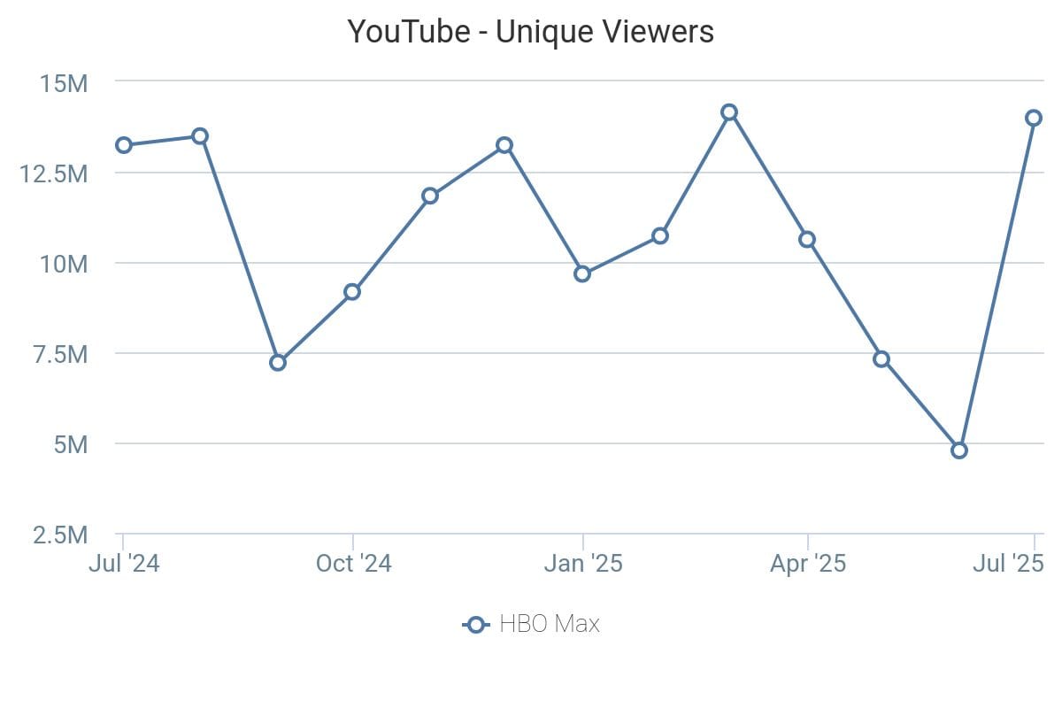 HBO Max’s YouTube audience saw significant growth in July as the streaming service leaned into promos for Peacemaker season two and IT: Welcome To Derry. Data from Tubular Labs reveals that HBO Max’s unique U.S. YouTube viewers grew by 193% month-over-month in July, nearing 13-month highs.