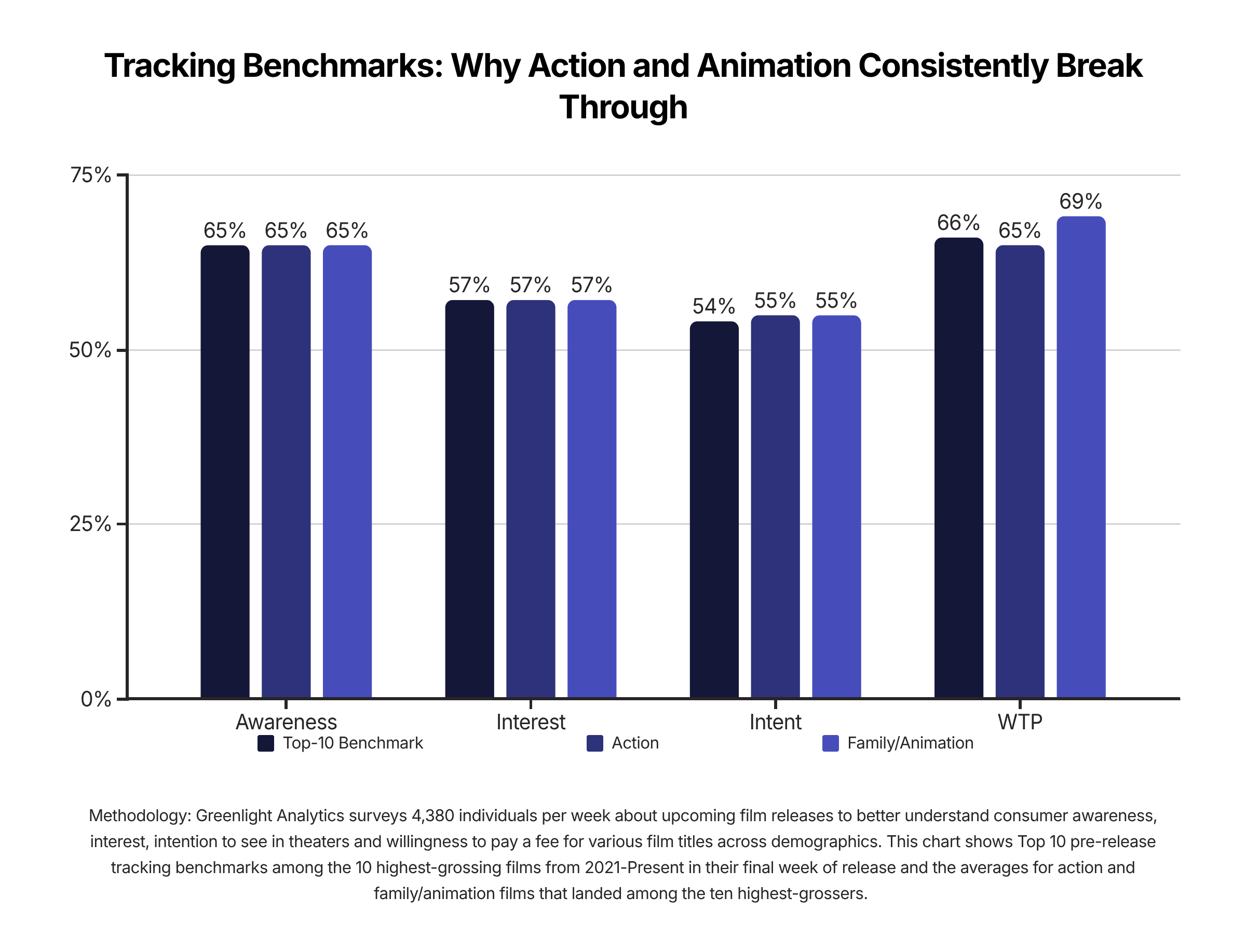 - In their final week, action-related films are regularly among the top 10 for indicators like awareness, interest, theatrical intent and willingness to pay.