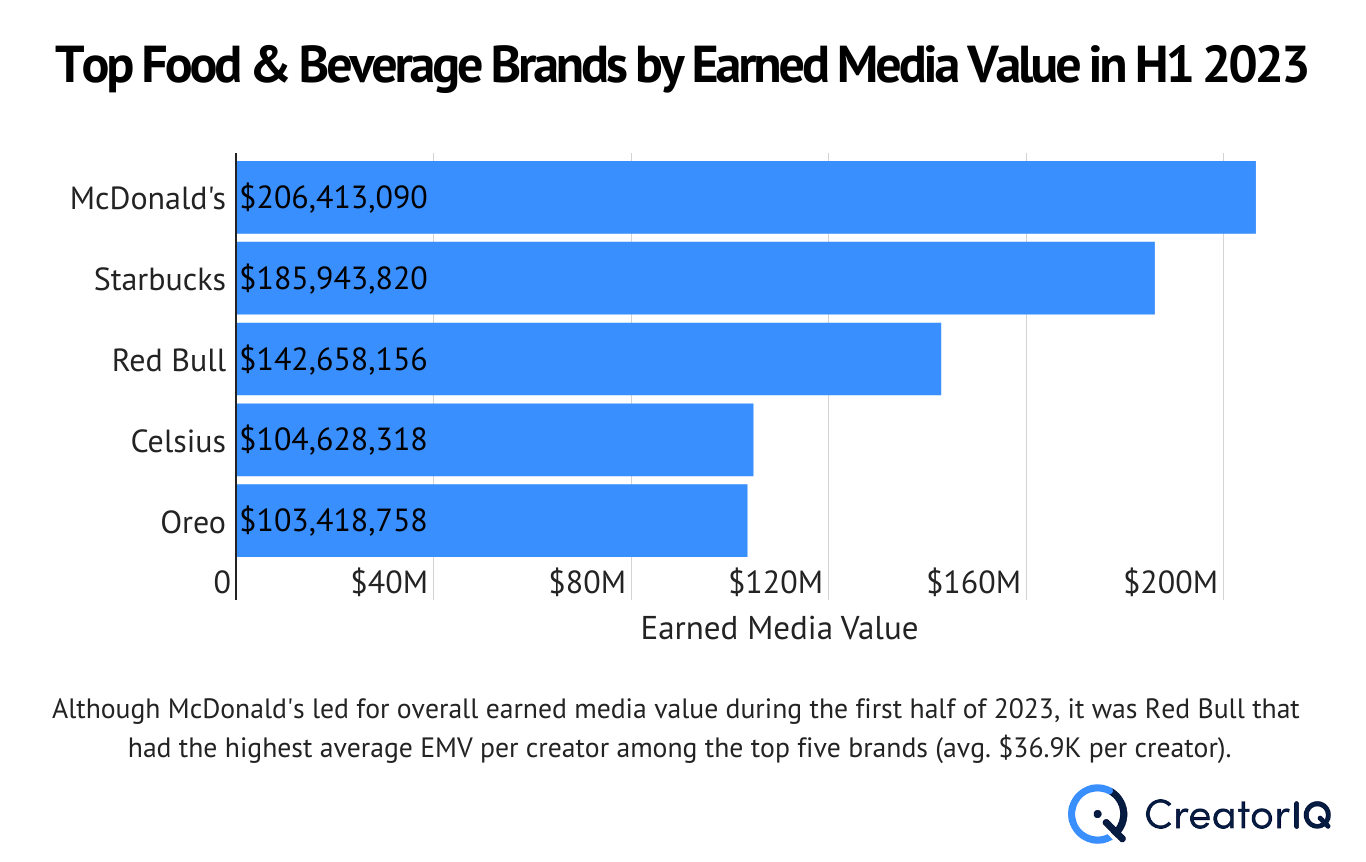 Since its beginning, social media has provided a simple and fun way for people to share what they're eating and drinking, and this year it's been no different: According to data from CreatorIQ, over 437,000 creators posted on social media about food and beverage brands in the first half of 2023. Collectively, they published 1.2 million posts, resulting in 75.4 billion impressions and 3 billion engagements, generating $4.8 billion in Earned Media Value (EMV) for the industry.