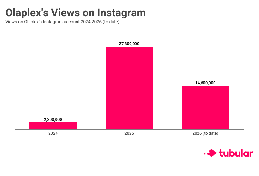 - On Instagram, Olaplex generated an over 1,000% increase in views from 2024 to 2025, with 3.2M views in Feb. 2026 alone.