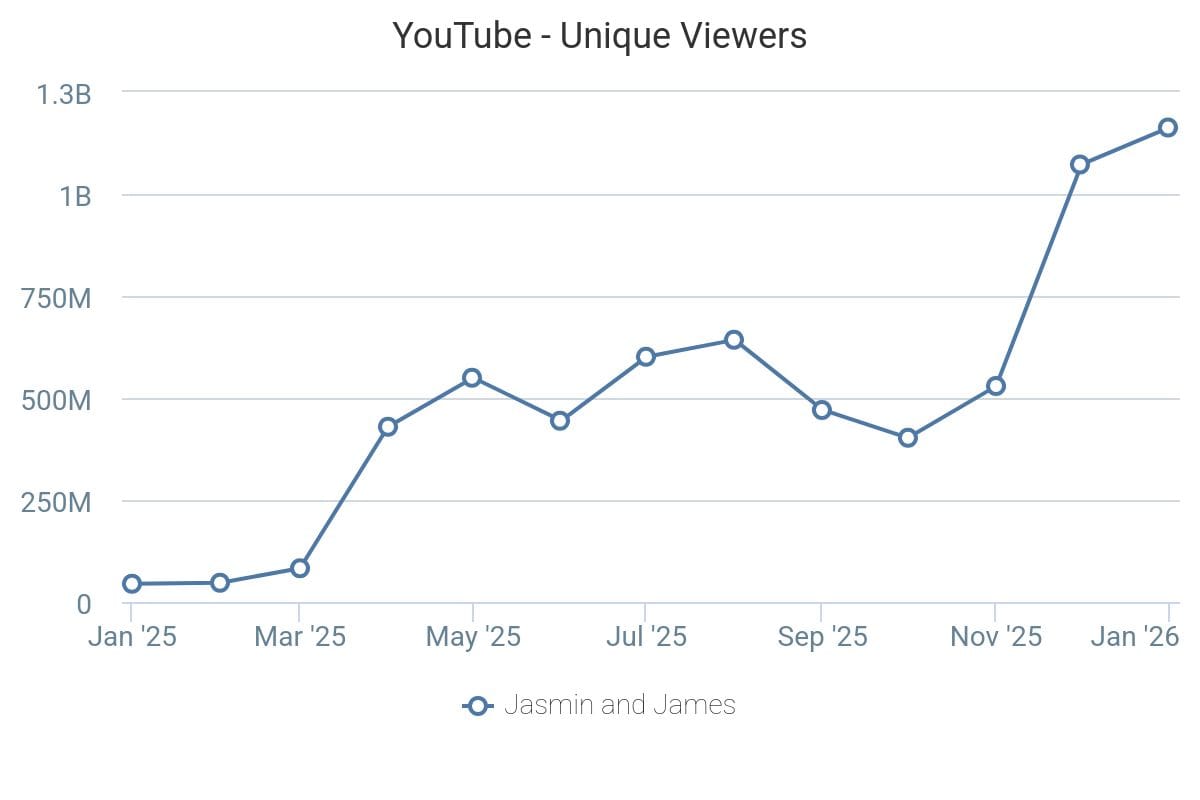 Data from Tubular Labs shows Jasmin and James had just 44.9 million unique global viewers on YouTube in January 2025, but that number has since ballooned to a stunning 1.2 billion in January 2026 – No. 2 among all individual creators worldwide. Jasmin and James were one of just four global YouTube accounts with over 1 billion unique viewers last month, and one of just 40 pages with over 2.2 billion minutes watched; despite leaning almost entirely on Shorts.