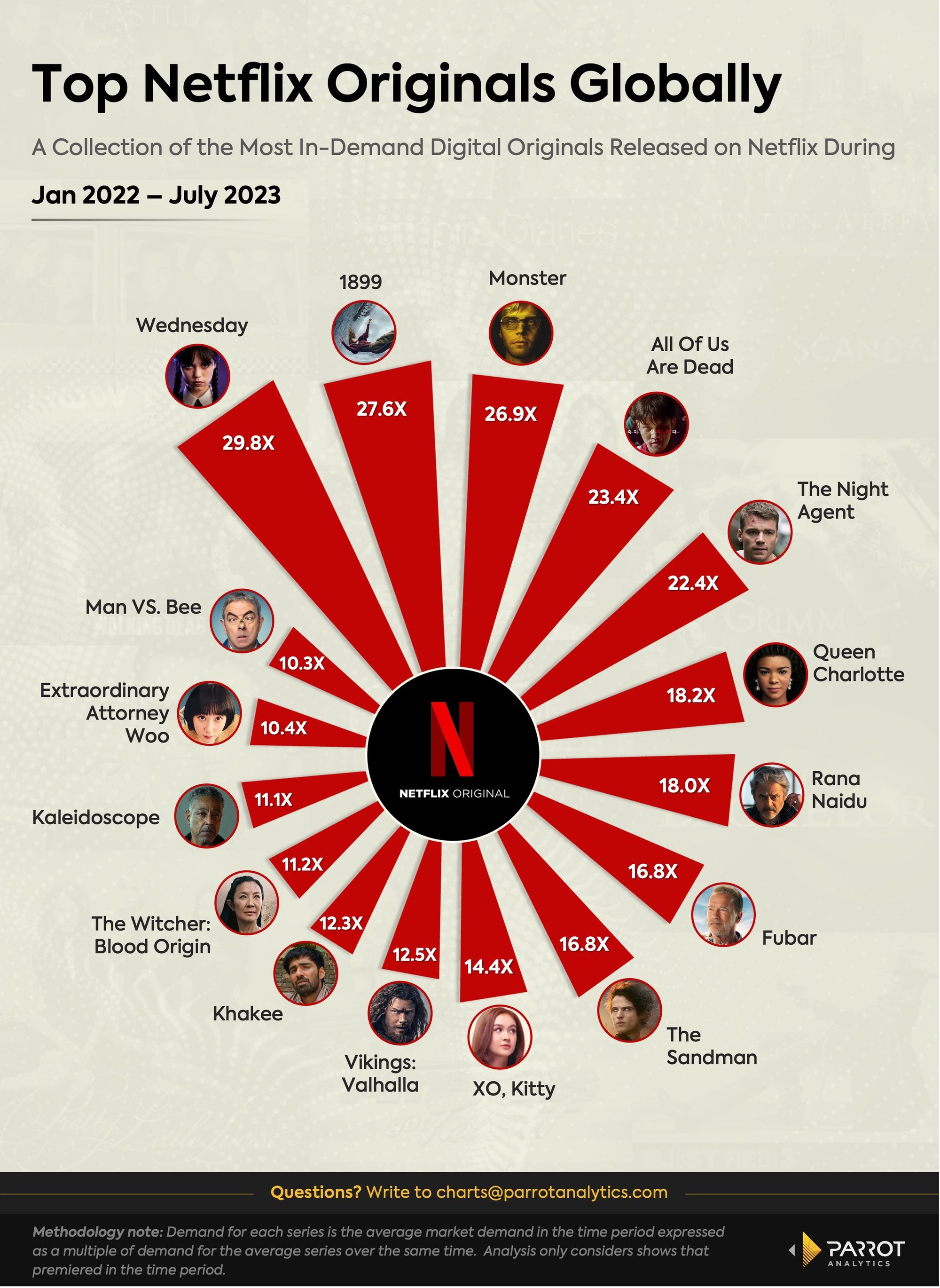 Netflix, the market-leading streamer, has also recognized what the rest of Hollywood has always known: franchises (or proven on-screen hits that generate multiple entries) elicit recurring interest. Continuations or expansions of existing franchises (Wednesday, Queen Charlotte, XO Kitty, The Witcher Blood Origin, Vikings Valhalla) are among Netflix’s best premieres in this time frame. Building out familiar IP helps ease audience buy in as viewers are more likely to sample a series connected to a brand they already enjoy. This can also lead to better retention, as viewers eagerly anticipate the next Bridgerton spinoff, which reduces churn. Locking in that viewer interest long term then provides a streamer with better pricing power.