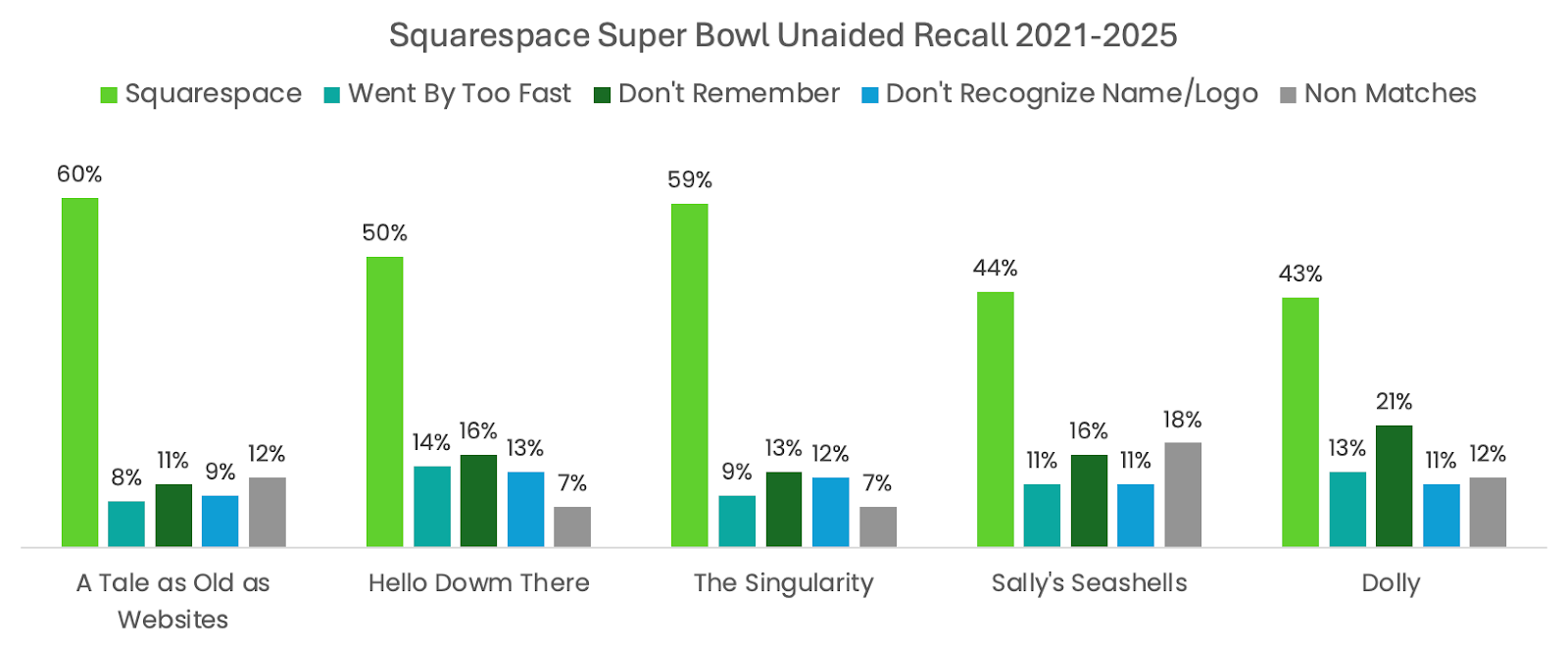 - Recognition Opportunity: Despite over a decade in the game, Squarespace's logo is not yet universally recognized, with 9%-13% of viewers each year reporting they do not recognize it—suggesting a need for more frequent on-screen text or opening branding.
