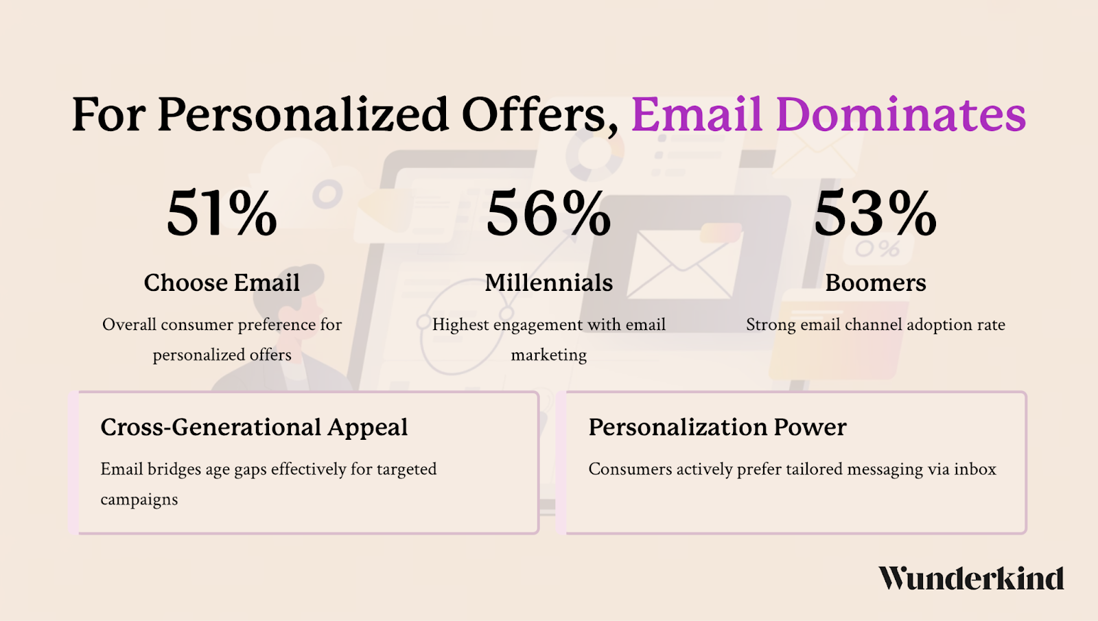 Recent data from Wunderkind shows that consumers of all ages prefer email for personalized offers, with 51% choosing it as the top channel for that type of outreach. Millennials were even more open to personalized email, at 56%. [READ MORE]