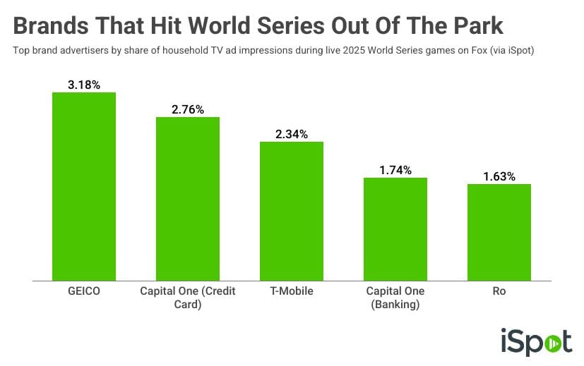 Across its credit card and banking businesses, Capital One accounted for 4.5% of TV ad impressions during the World Series, according to data from iSpot. However, insurance was the No. 1 industry, at 7.45% of all World Series TV ad reach over seven games. [READ MORE]