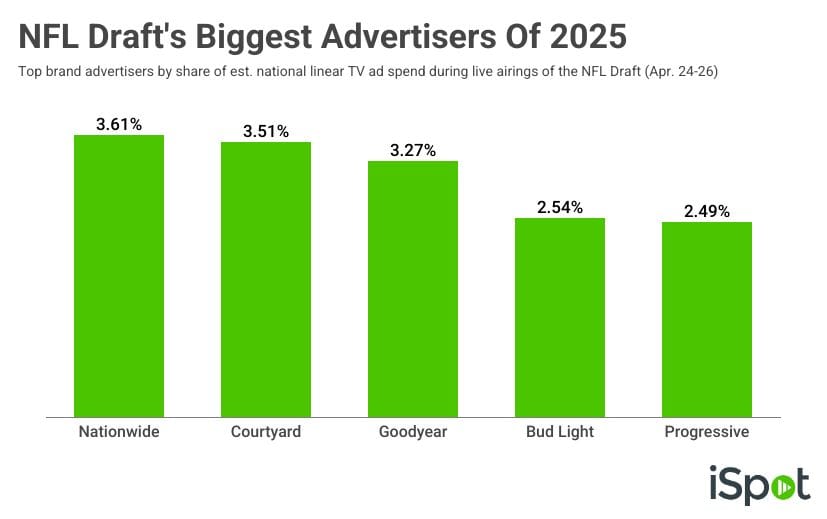 - Both Nationwide (3.61% of spend) and Progressive (2.49%) were among the top advertisers by share of est. national linear TV ad spend over the course of the NFL Draft, and insurance led the way among all industries – with 11.14% of spend.