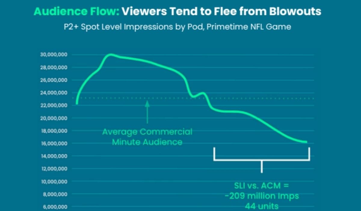 NFL advertisers have to be careful about where they put their ads within games. While most NFL games start with high ratings, viewers tend to flee blowouts. That creates risk when buying spots after halftime because spots are bought based on average commercial minute ratings for the whole game, but spots are actually seen by the people still tuned in.