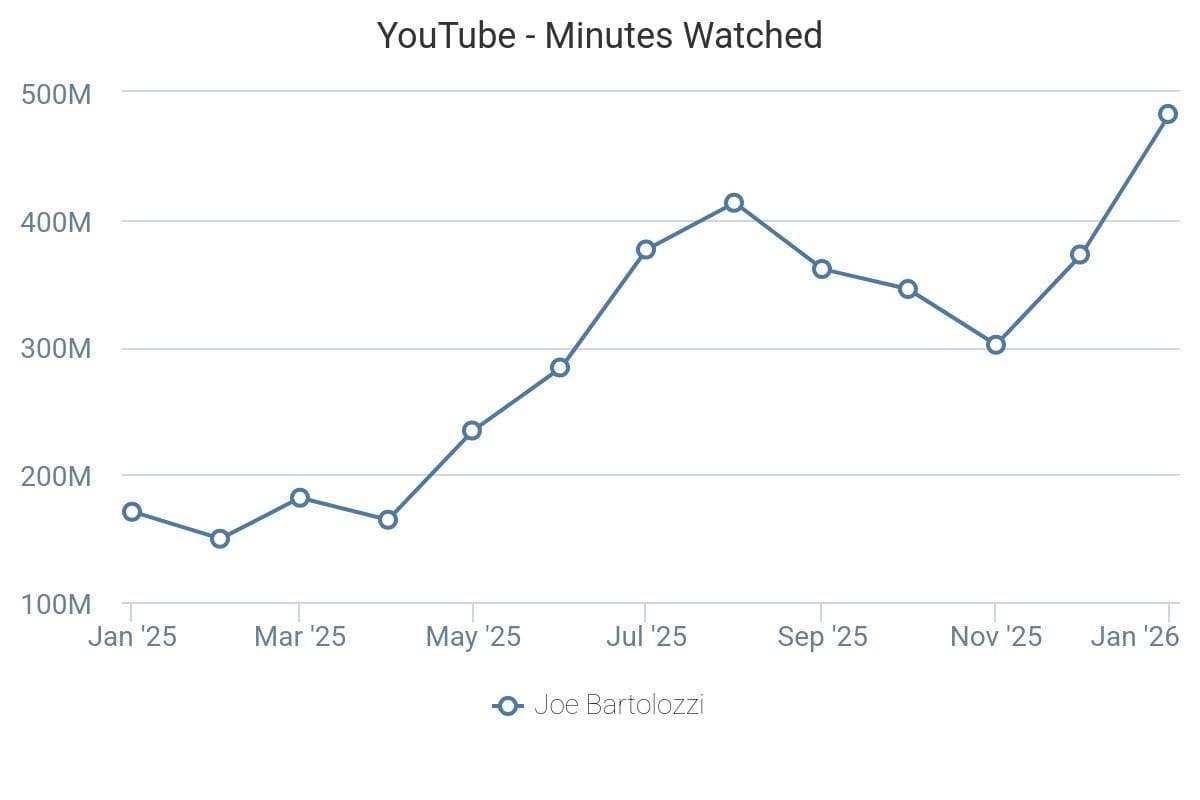 - Bartolozzi’s humorous long-form videos have fueled a year-over-year increase of over 300 million minutes watched, and even recent months have seen him climb by 100 million alone from December to January.
