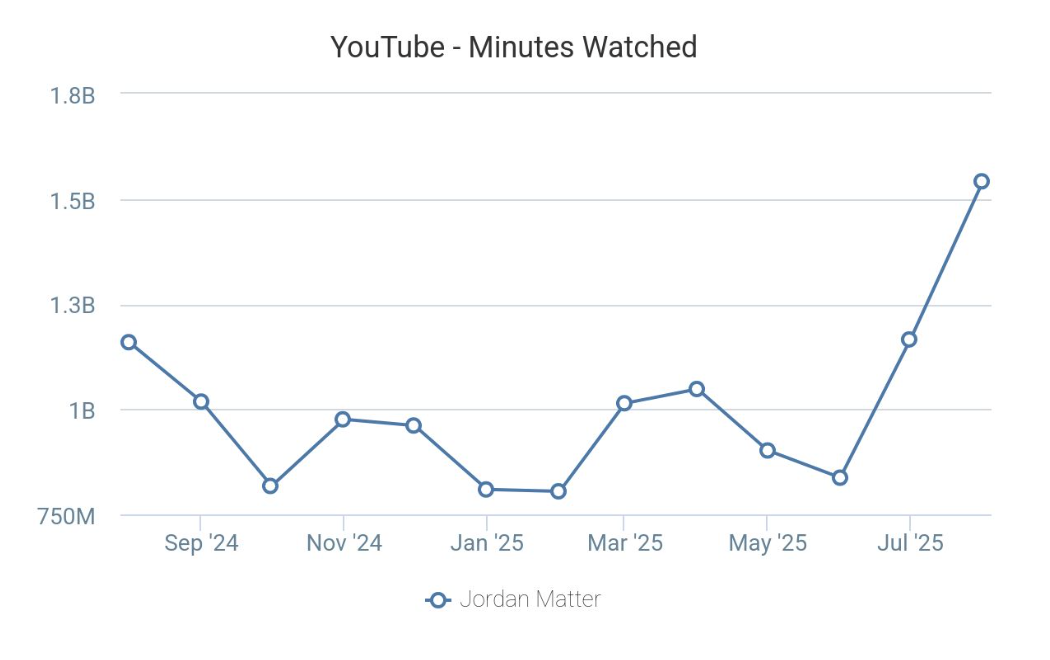 - In Aug. 2025, Matter’s channel saw U.S. YouTube watch-time grow by 32% month-over-month – to 1.5 billion minutes – putting it squarely at No. 2 among domestic creators (only trailing kids video giant Ms. Rachel).