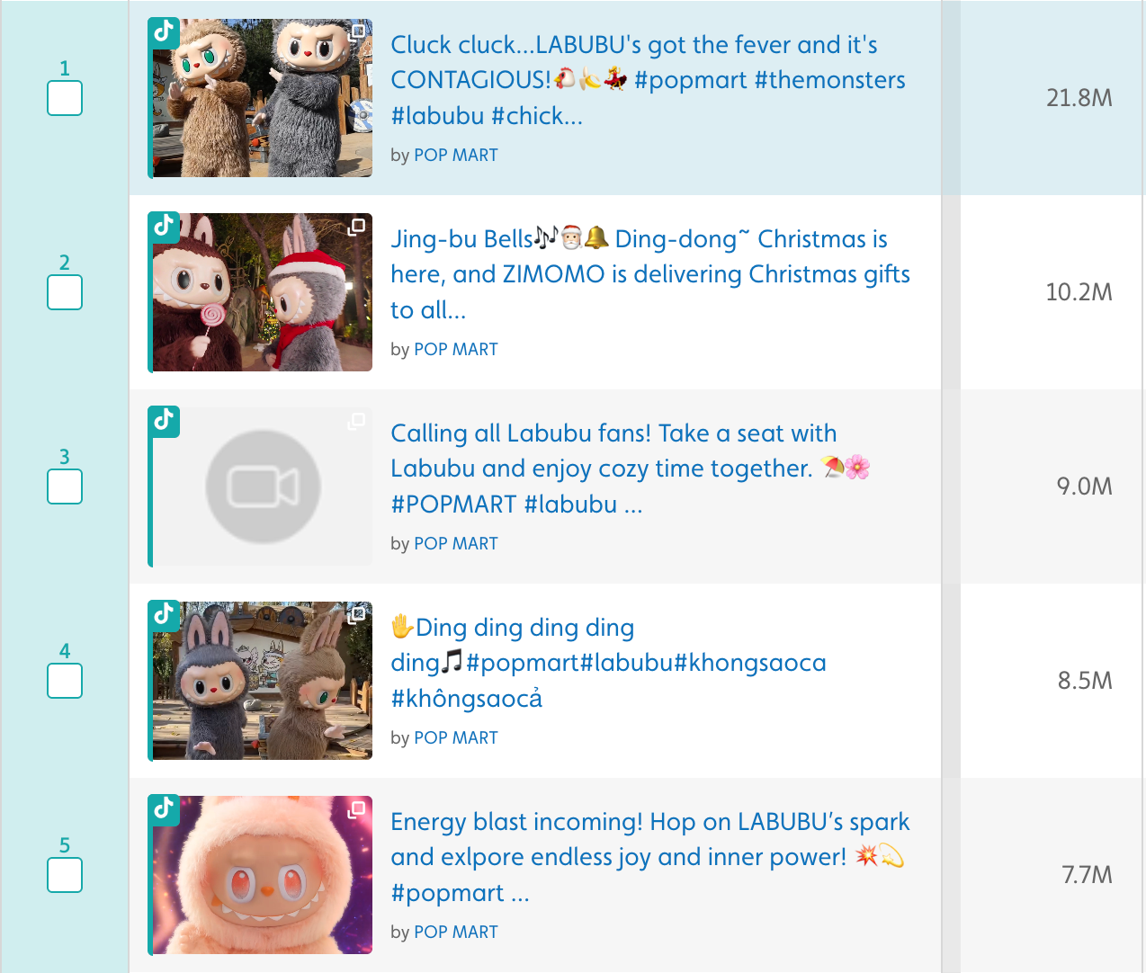 According to Tubular Labs, in 2024, “Labubu” TikToks got 5.1B views in total. In 2025, that number grew almost five times as much, with 24.1B views to date.