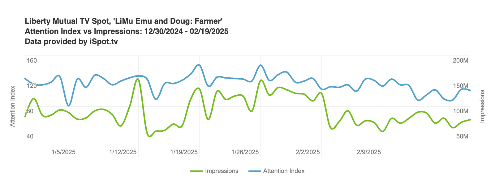 - Of the four ads Liberty Mutual has been running on linear TV this year, "Farmer" has the highest attention, too – further justifying why the brand has continued to lean on it most heavily since it first appeared on Dec. 30, 2024.